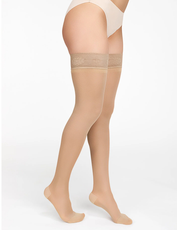 Женские чулки с ажурным верхом 216 Orto 1 класс компрессии, полупрозрачные. Создают умеренную дозированную компрессию от лодыжки до верхней трети бедра. Имеют силиконовую ленту в верхней части для фиксации.